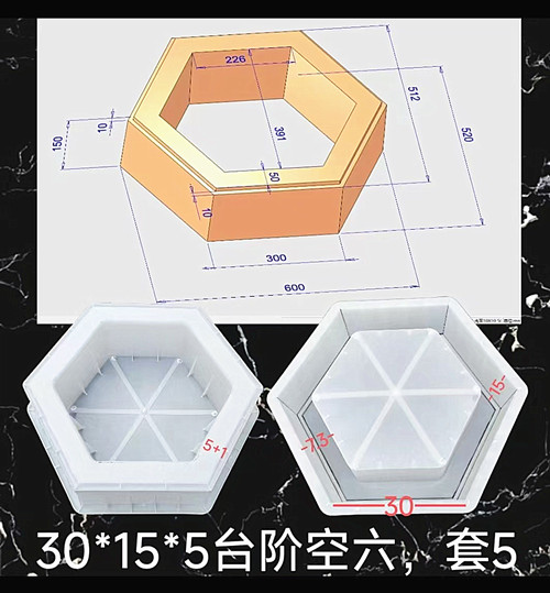 六角护坡模具常用尺寸:15*15*5、15*15*6cm、15*15*8、15*15*10、15*15*12、15*15*15cm、17.3*17.3*8、17.3*17.3*10、17.3*17.3*15、17.3*17.3*16cm、20*20*5、20*20*6cm、20*20*8、20*20*10、20*20*12cm、20*20*15、20*20*18cm、20*20*20cm、20*20*25cm、23*23*12cm、25*25*6、25*25*8、25*25*10、25*25*12cm、25*25*15。这些都是一些常规的尺寸,其它的异形护坡模具的尺寸,根据情况可以根据图纸定做。